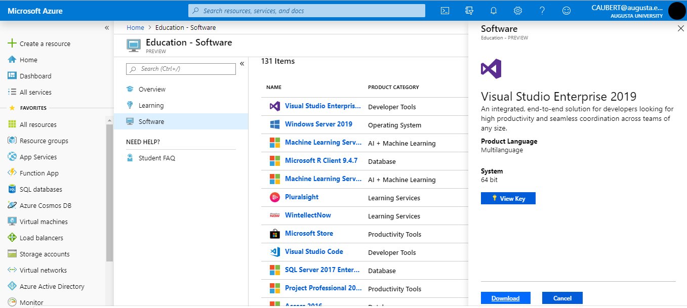 Look for Visual Studio. The path is Education → Software → Visual Studio Enterprise 2019. You can search “Services” for the “Education” group and then click “Software” if the education group is not immediately displayed. It should look like the following: