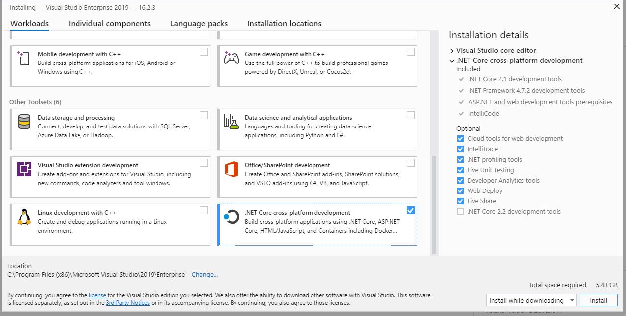 If possible, check the box next to “Workload” → “Windows” → “.NET-Desktop Development”, or to “Workload” → “Other Toolsets” → “.NET Core cross-platform development”: